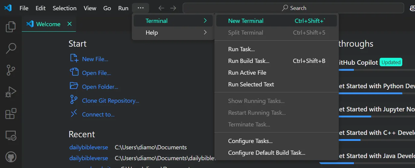 - At this point, your VS Code should be in the working directory of the folder you have recently or previously created.
